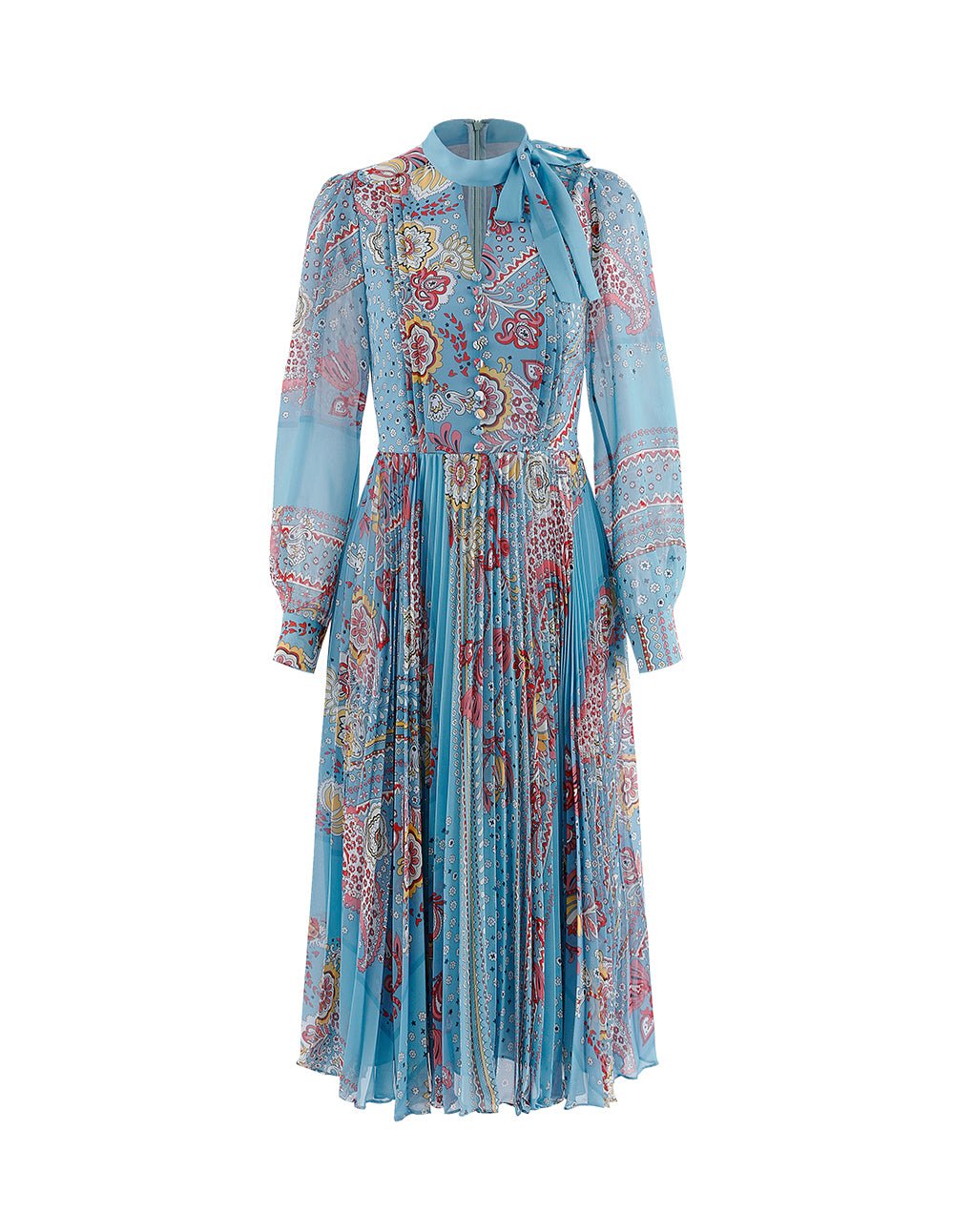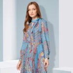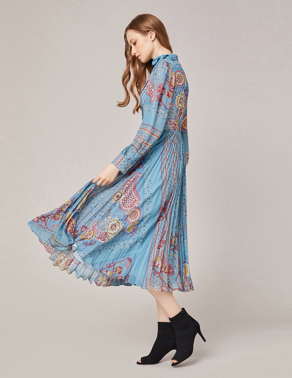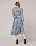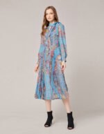 Elegant and artistic georgette prints is inspired by traditional turkish art. The dress has a long and flowing maxi style. with an accordion pleat skirt and neck tie for a retro look that has a romantic feel enhanced by the soft washed pastel colourway.