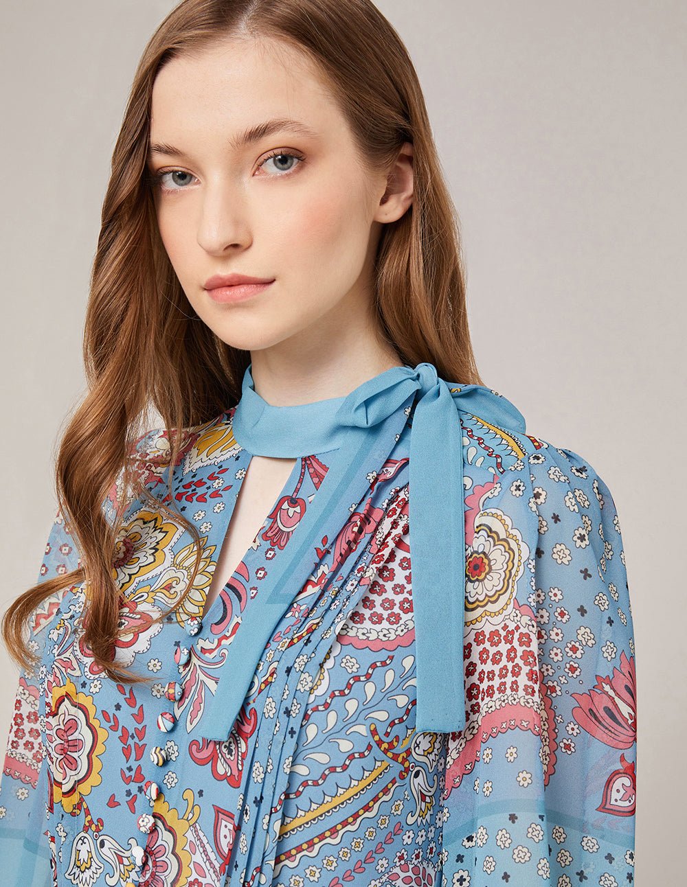 Paisley print. exquisite patternSmall stand-up collar and V-shaped hollow details. reducing dullness and full of stylingPleated design is more layered and dynamic