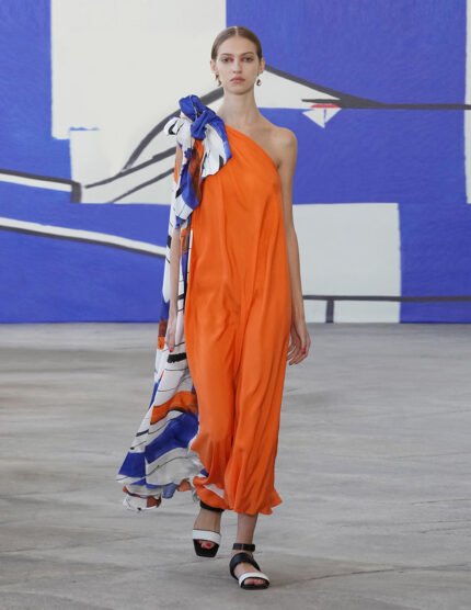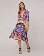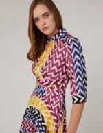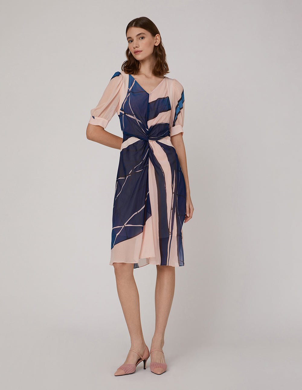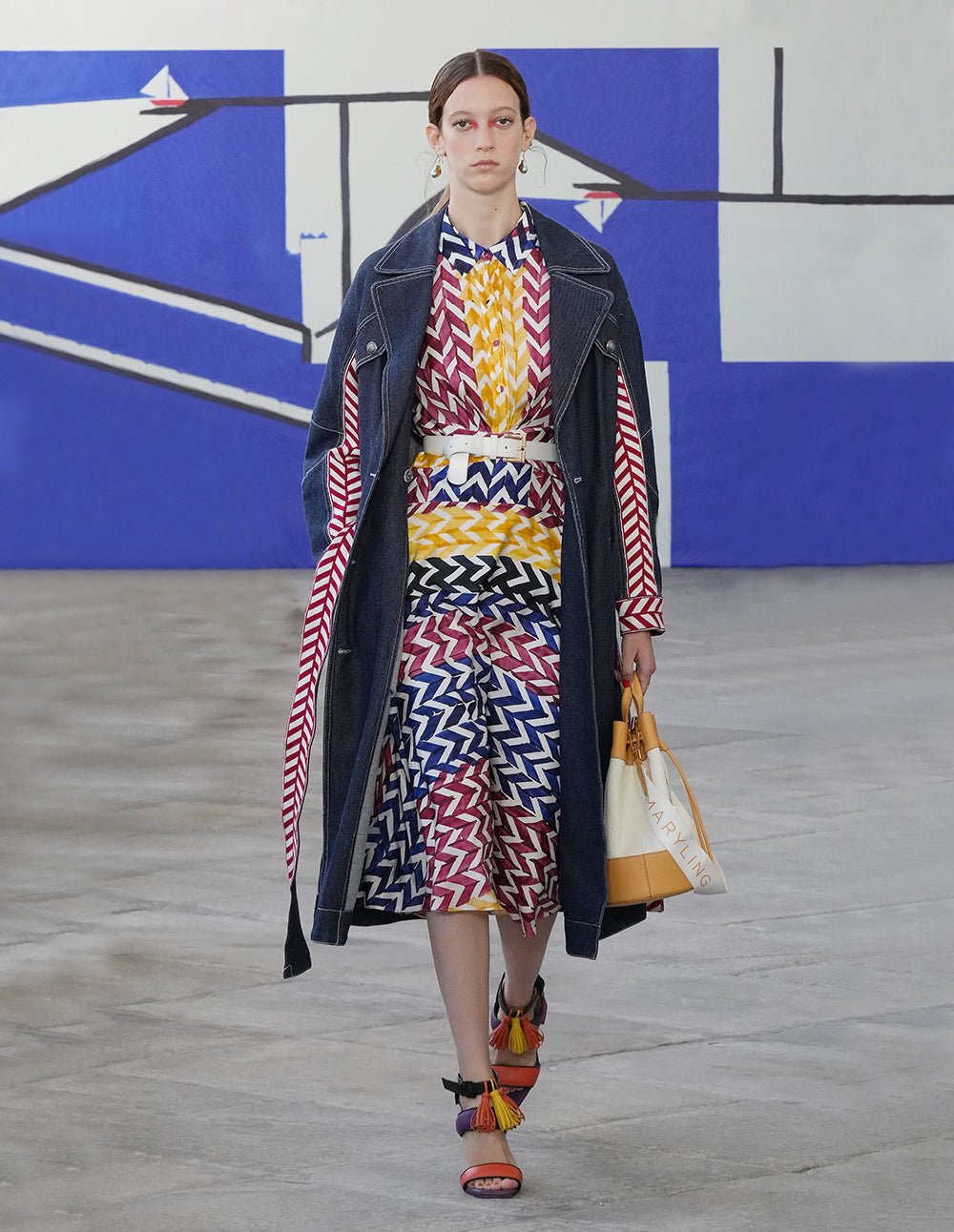 The nautical-inspired colourful woven stripe print is presented in bold colour schemes and hand-painted forms. with a distinctive texture that emerges. The silk crepe de chine material is skin-friendly and comfortable. the upper body drapes smoothly and elegantly. the waist cross structure modifies the waist line. and expresses a romantic and beautiful. full of the colours of spring and summer.