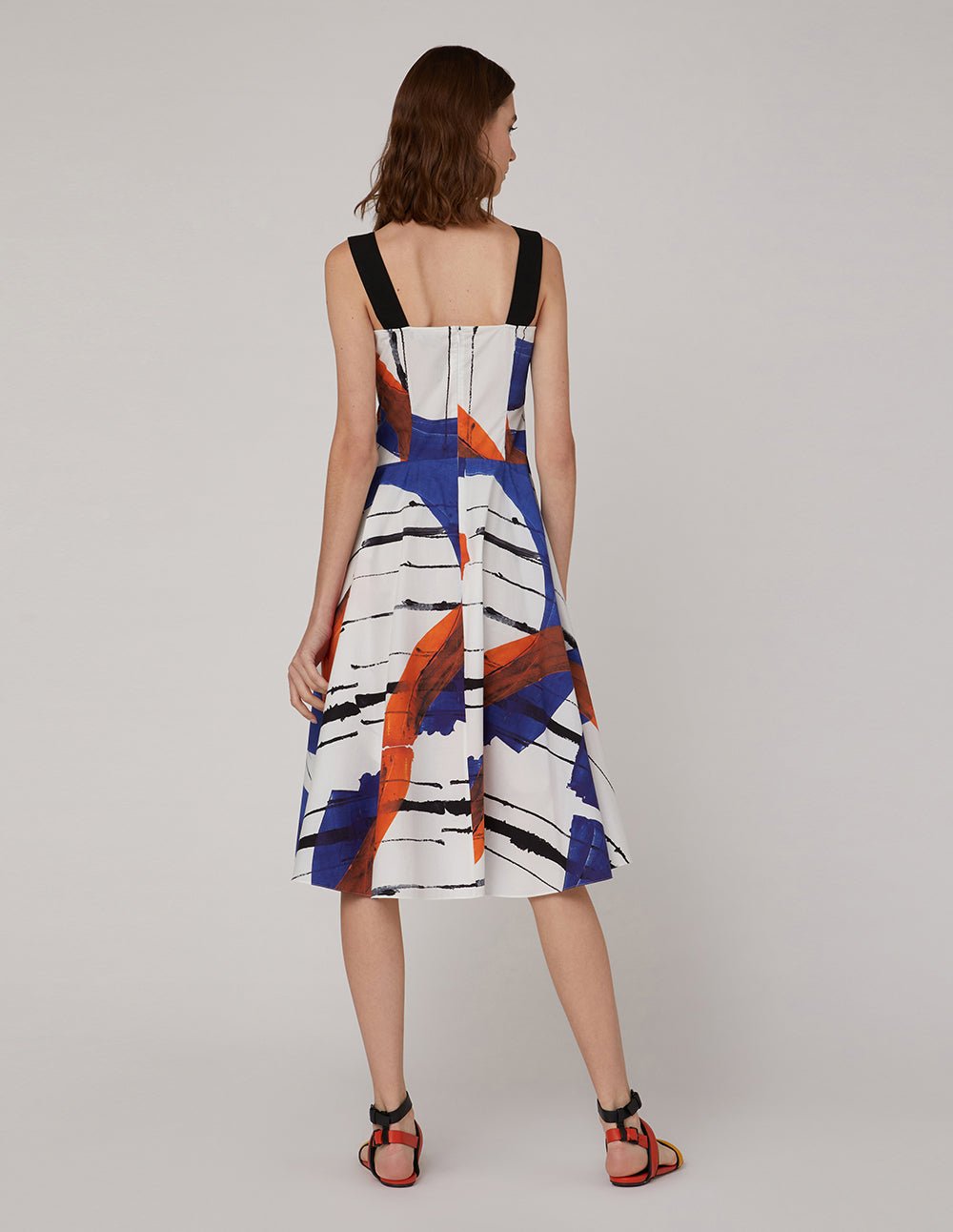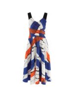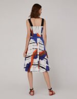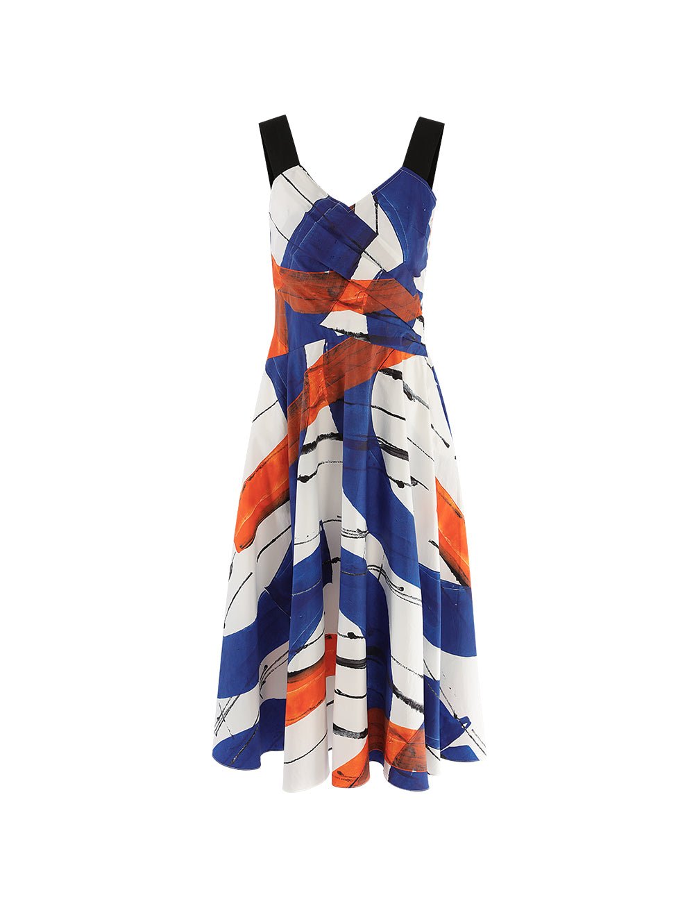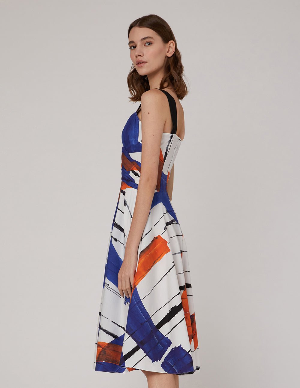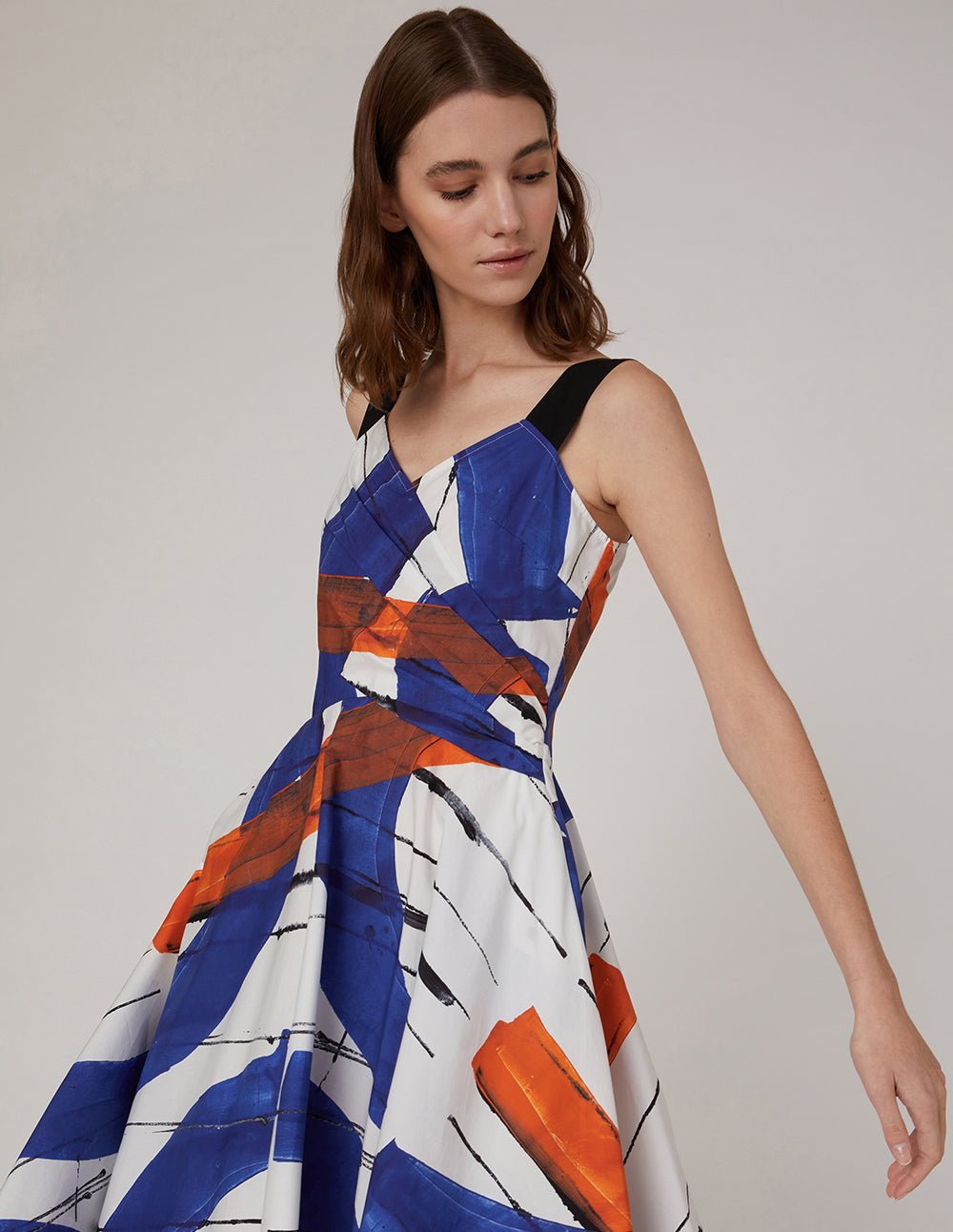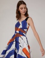 Create Italian elegance with highly visual abstract prints and details. Injecting a strong artistic atmosphere. the contrasting wide shoulder straps overlap with the V-neck to reveal the collarbone. The A-line skirt and rich pleated details bring femininity for a confident and glamorous look. .