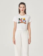 MARYLING is inspired by printing patterns. It uses the thick and lively century school book font as the decorative pattern and uses three-dimensional toothbrush embroidery technology to interpret it. The short T-shirt version. three-dimensional embroidery. and toothbrush embroidery show exquisite embroidery craftsmanship. and the college style is more youthful and energetic.